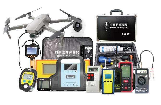 无线监视器、航拍监测无人机、硫酰氟检测仪、磷化铝检测仪、溴甲烷监测仪、测距仪、测温仪、温度计、湿度计、风速仪、病媒监测工具、白蚁勘测仪、探温针、害虫选筛。